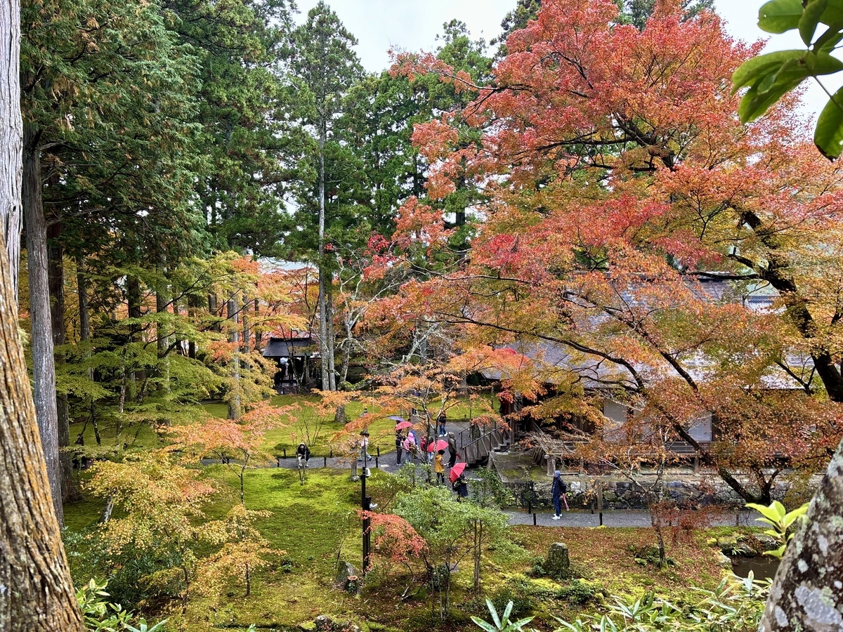 眼下に広がる三千院を見渡せるのも、大原の地形がなせる技。いやはや、素晴らしい!参拝者の傘の赤色もアクセントになって可愛い♪